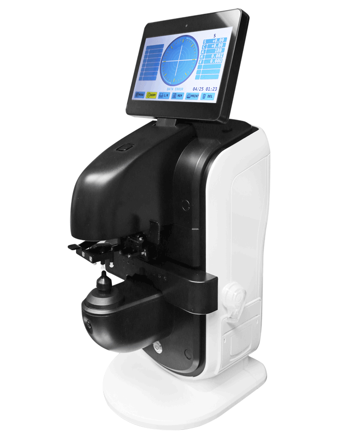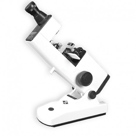 Este lensómetro puede medir lentes esféricos o cilíndricos, dioptrías, eje de astigmatismo de lente cilíndrico, prismas y marca del centro óptico, eje de lente cilíndrico y base de prisma. Con accesorios se puede medir los lentes de contacto también.
