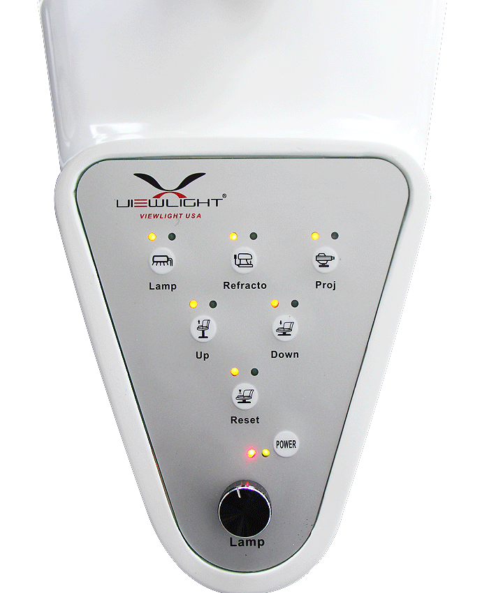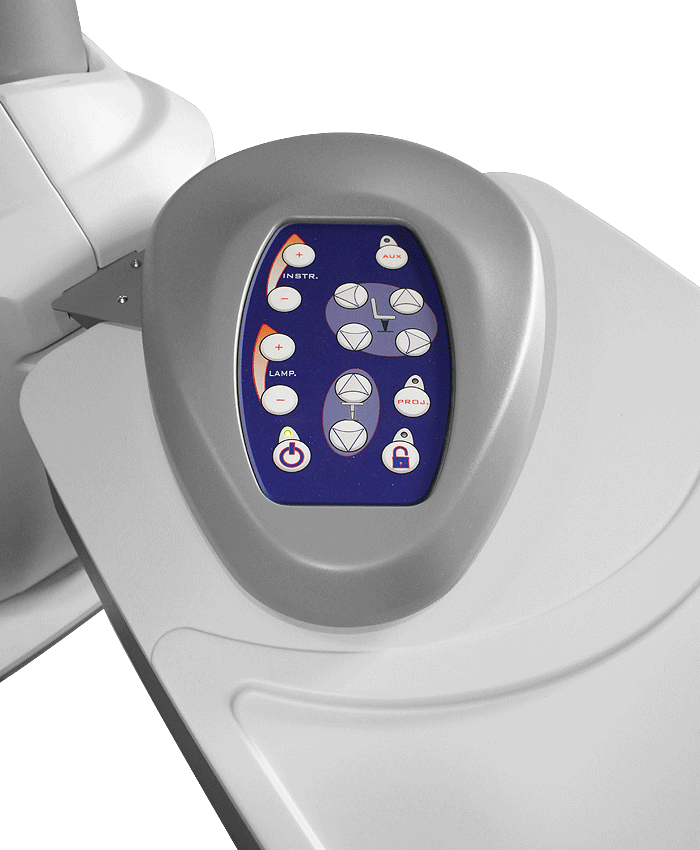 Interruptores de la consola encienden y apagan el proyector, levantan y baja la silla de examinación, controlan la intensidad de medidores indirectos y traen la silla automáticamente a su posición vertical.